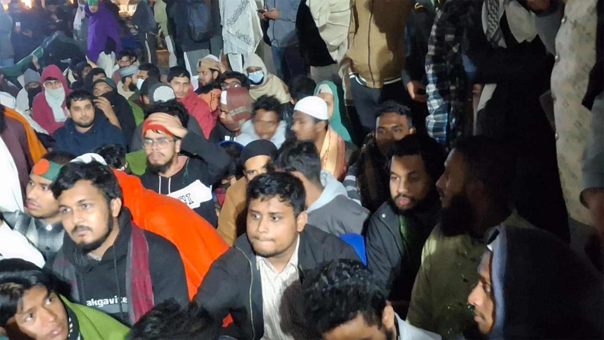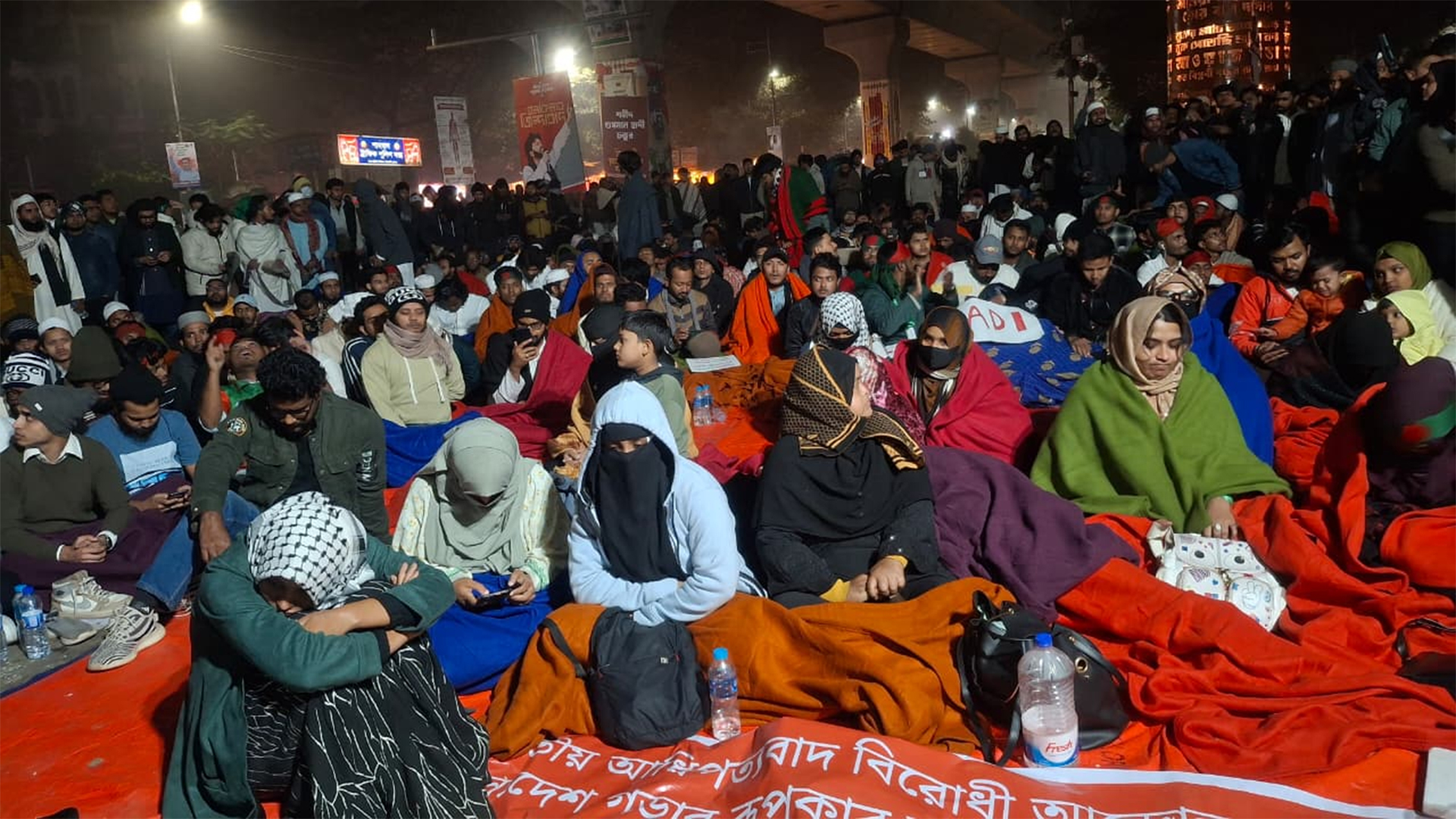 শুক্রবার (২৬ ডিসেম্বর) দিবাগত রাত আড়াইটার দিকে সরেজমিনে দেখা যায়, মধ্যরাতের হিমেল হাওয়ায় শরীর গরম রাখতে কেউ কম্বল গায়ে জড়িয়েছেন, কেউ বা একে অপরের কাঁধে হাত রেখে গোল হয়ে বসে আছেন। তবে চোখেমুখে ক্লান্তি নেই, আছে দ্রোহ। রাজশাহী বিশ্ববিদ্যালয় কেন্দ্রীয় ছাত্রসংসদ (রাকসু) সাধারণ সম্পাদক সালাউদ্দীন আম্মার এবং ইনকিলাব মঞ্চের সদস্য সচিব আবদুল্লাহ আল জাবের স্লোগান দিচ্ছেন। তাদের স্লোগানে কেঁপে উঠছে রাজপথ।