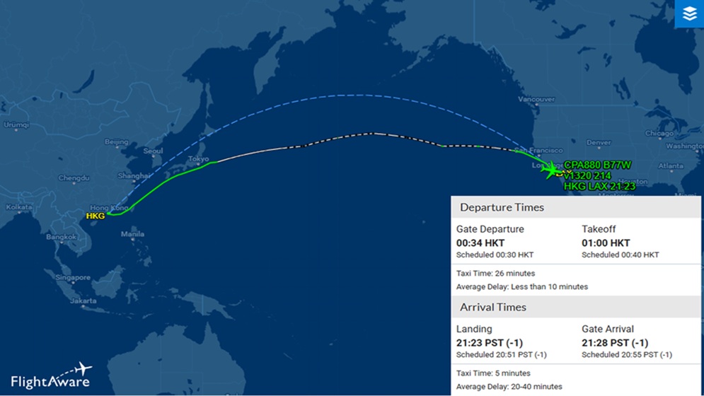ক্যাথে প্যাসিফিকের ফ্লাইট CX880 ১ জানুয়ারী, ২০২৬ তারিখে উড্ডয়ন করে এবং ৩১ ডিসেম্বর, ২০২৫ তারিখে লস অ্যাঞ্জেলেসে অবতরণ করে। গ্রাফিক: ফ্লাইটঅ্যাওয়্যার