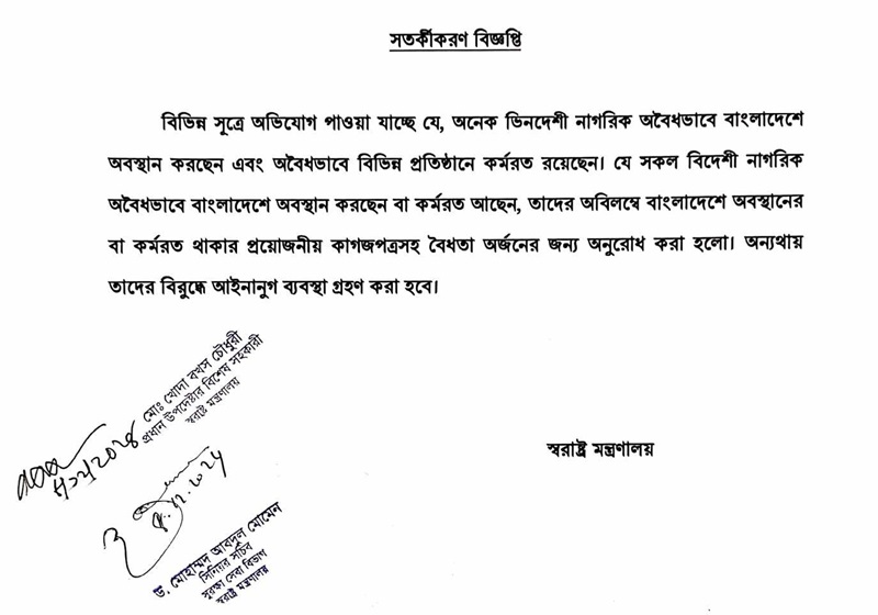 গণমাধ্যমে পাঠানো এই বিজ্ঞপ্তিতে বলা হয়, ‘বিভিন্ন সূত্রে অভিযোগ পাওয়া যাচ্ছে যে, অনেক ভিনদেশি নাগরিক অবৈধভাবে বাংলাদেশে অবস্থান করছেন এবং অবৈধভাবে বিভিন্ন প্রতিষ্ঠানে কর্মরত রয়েছেন। যে সকল বিদেশি নাগরিক অবৈধভাবে বাংলাদেশে অবস্থান করছেন বা কর্মরত আছেন, তাদের অবিলম্বে বাংলাদেশে অবস্থানের বা কর্মরত থাকার প্রয়োজনীয় কাগজপত্রসহ বৈধতা অর্জনের জন্য অনুরোধ করা হলো। অন্যথায় তাদের বিরুদ্ধে আইনানুগ ব্যবস্থা গ্রহণ করা হবে।’